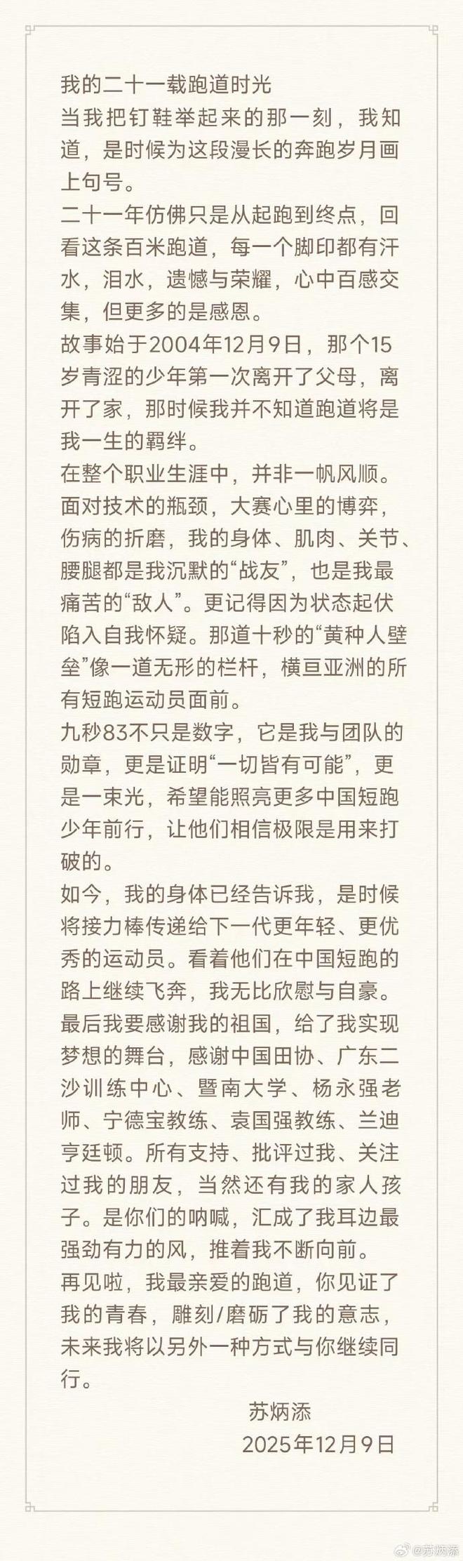 二十一年的路途结束了!苏炳添在社交媒体上发